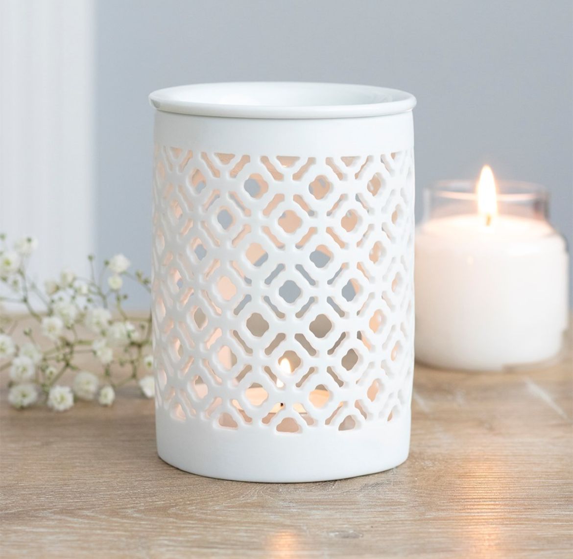 Quemador de cerámica en color blanco mate con diseño texturizado tipo celosía. Funciona con vela de té, ideal para wax melts y aceites esenciales. Aporta un toque decorativo y elegante, además de llenar tu hogar con una fragancia agradable.
