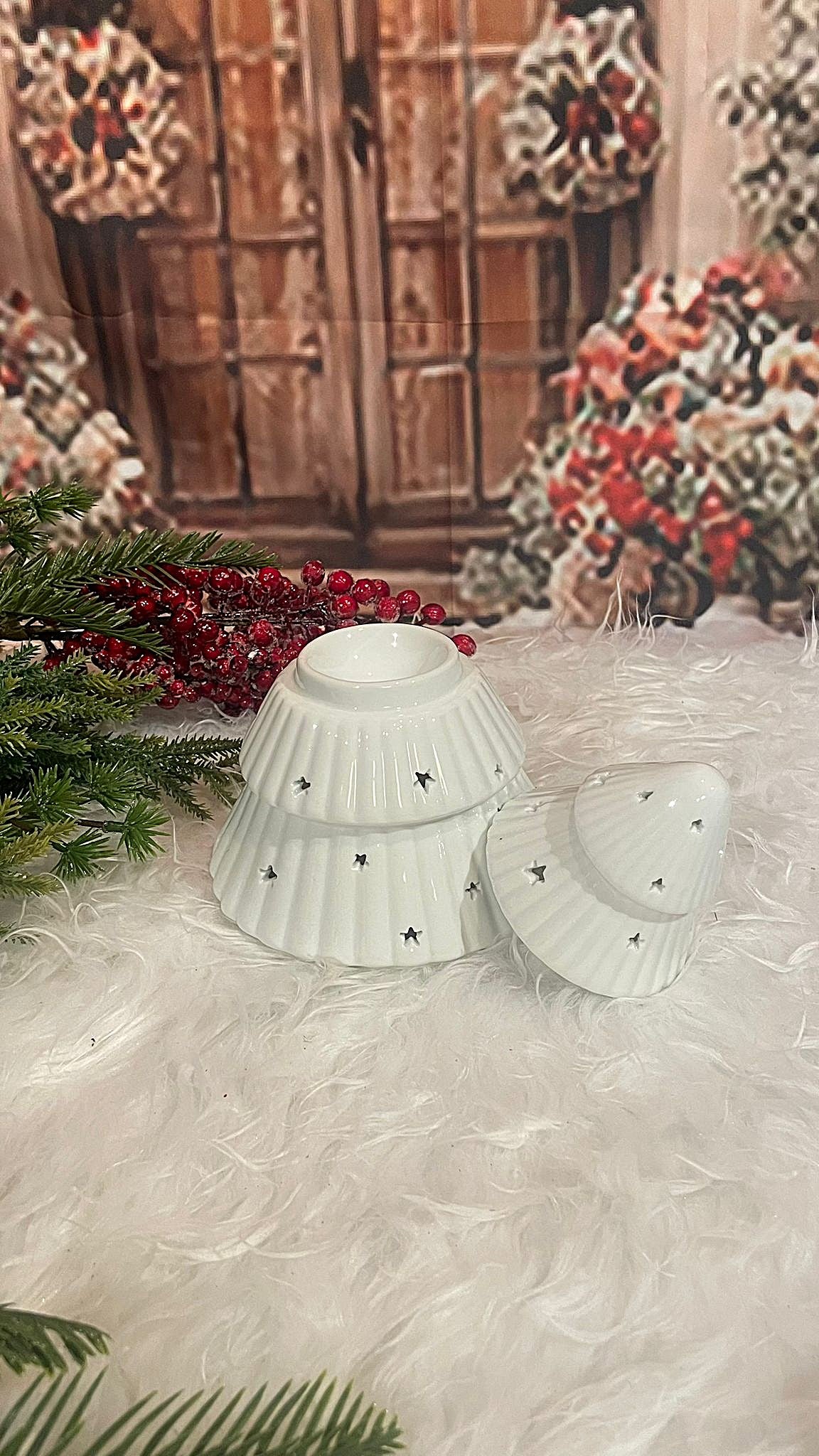 Decora tu hogar con un toque mágico estas fiestas. Nuestro encantador quemador de cerámica, con diseño de árbol de Navidad blanco y delicadas estrellas caladas, se convierte en el centro de atención cuando colocas una velita de té en su interior.