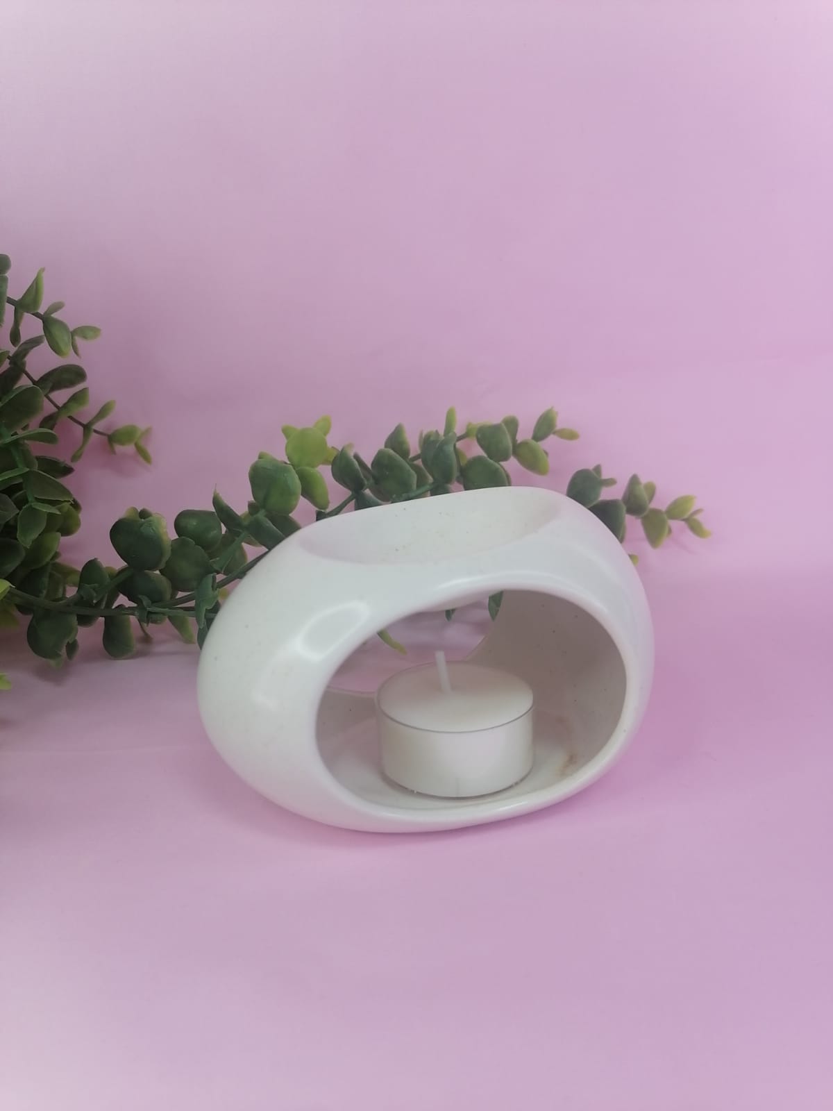 Este quemador cuya forma es preciosa y no te ocupa mucho espacio es de completamente de cerámica y su color es un blanco crudo con puntitos.